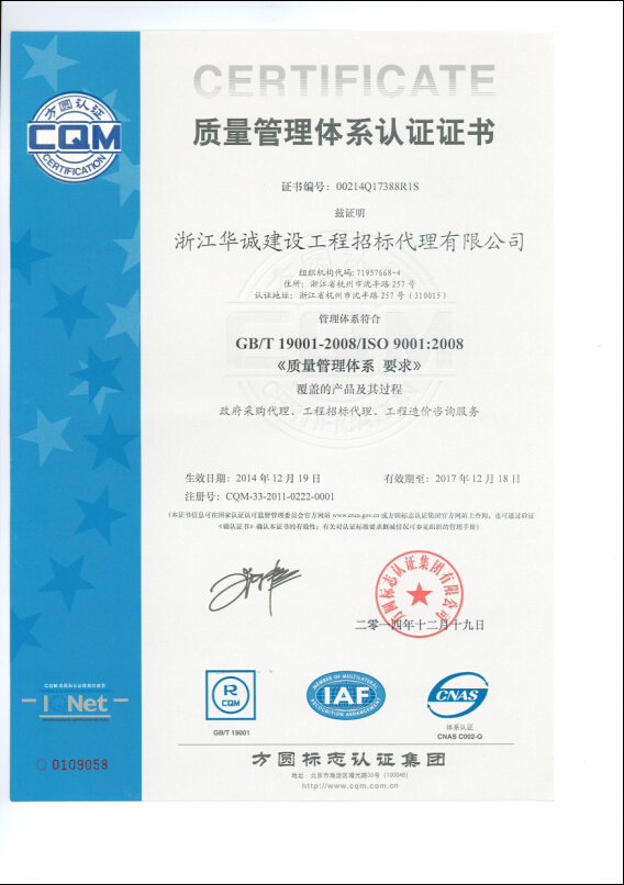 質(zhì)量管理體系認(rèn)證證書